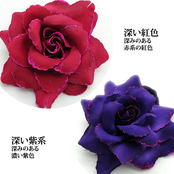 セール価格 シックなバラ お花のコサージュ 花びらの淵に、ラメ加工を施し、キラキラ華やか 花びらを重ね合わせた、立体感のあるお花です 華やかで上品なお色で、様々なコーディネートをより華やかにしてくれます! 浴衣、披露宴、二次会、発表会、演奏会、同窓会など様々なパーティースタイルでドレスやワンピースを華やかに◎ 卒業式、入学式、卒園式、入園式、学校行事や式典で、セレモニースタイルを上品に クリップ が付いているので髪飾りやヘッドドレスとしてもご使用頂けます。