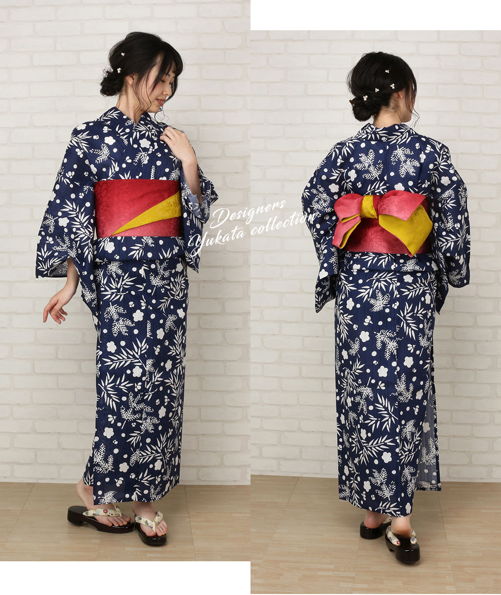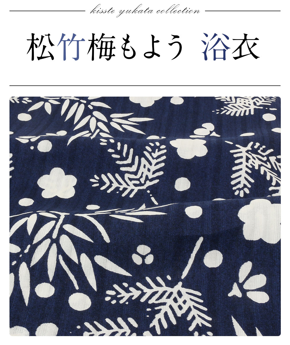 商品情報 色・柄 紺 / 松竹梅 素材・織り 綿100% / 変わり織 サイズ 着物丈:約165cm 袖丈:約49cm 裄丈:約68cm ブランド はいばら 製造 日本製 ※こちらの商品は浴衣単品での販売です。