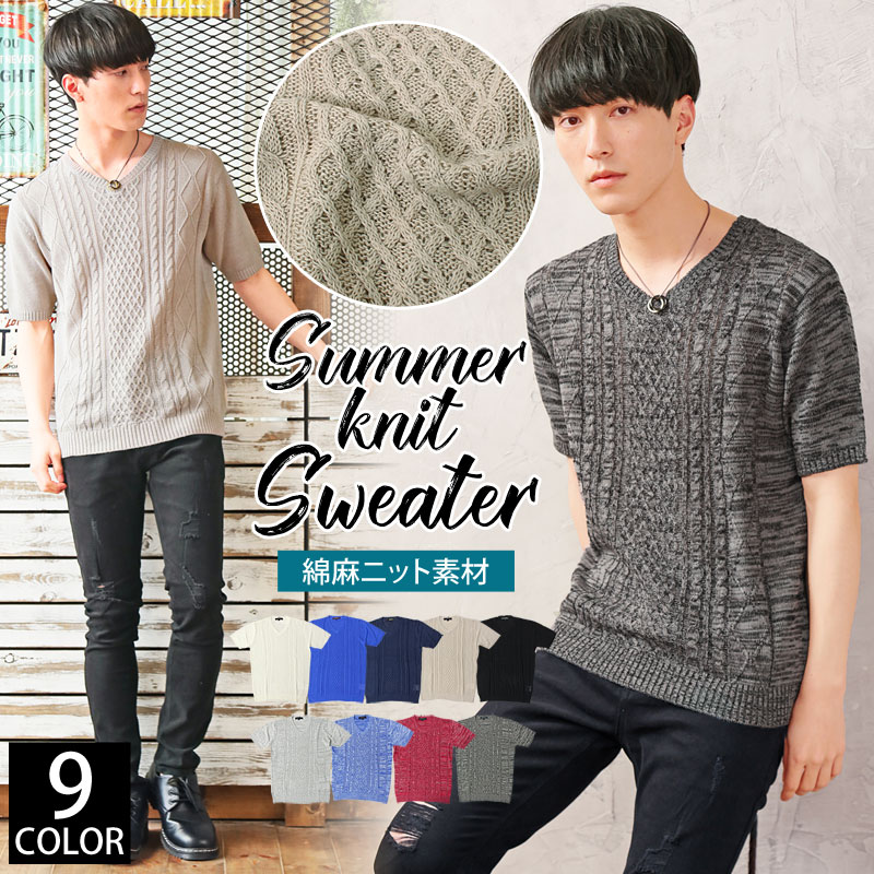 送料無料 サマーニット メンズ Tシャツ 半袖 大きいサイズ ニットソー 綿麻 リネン Vネック プルオーバー 薄手 夏男 無地 フィッシャーマン ケーブル カットソー セーター トップス アメカジ 通販 新作 おしゃれ 春 夏 トップイズム ゆうパケ